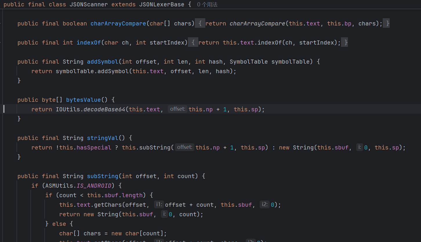 fastjson在反序列化时,如果Field类型为byte[],将会调用com.alibaba.fastjson.parser.JSONScanner#bytesValue进行base64解码,所以在序列化时也会进行base64编码